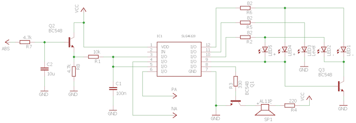 The last stage of the signal conditioning, denoted by Block 3, performs filtering and signal buffering. Figure 10 shows an overall schematic of the GreenPAK SLG46120V IC interfacing with external parts. The output signal from Block 2 is labelled ABS.