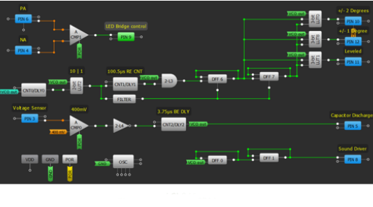 Figure 12 shows this GreenPAK design. We can also identify internal functions: VCO, LED control and the Sound Driver.
