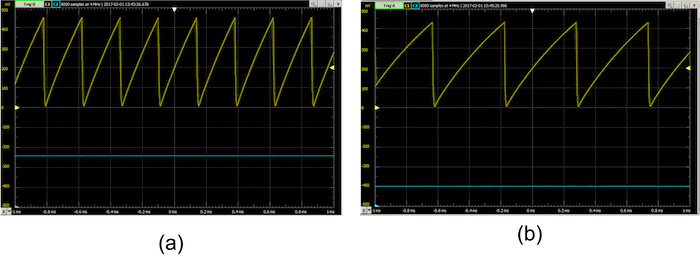 Figure 13. The VCO output according to the horizontal alignment: (a) Input voltage of 1.8 volts and frequency of 4.1 KHz, (b) Input voltage of 1.0 volts and frequency of 2.1 KHz.