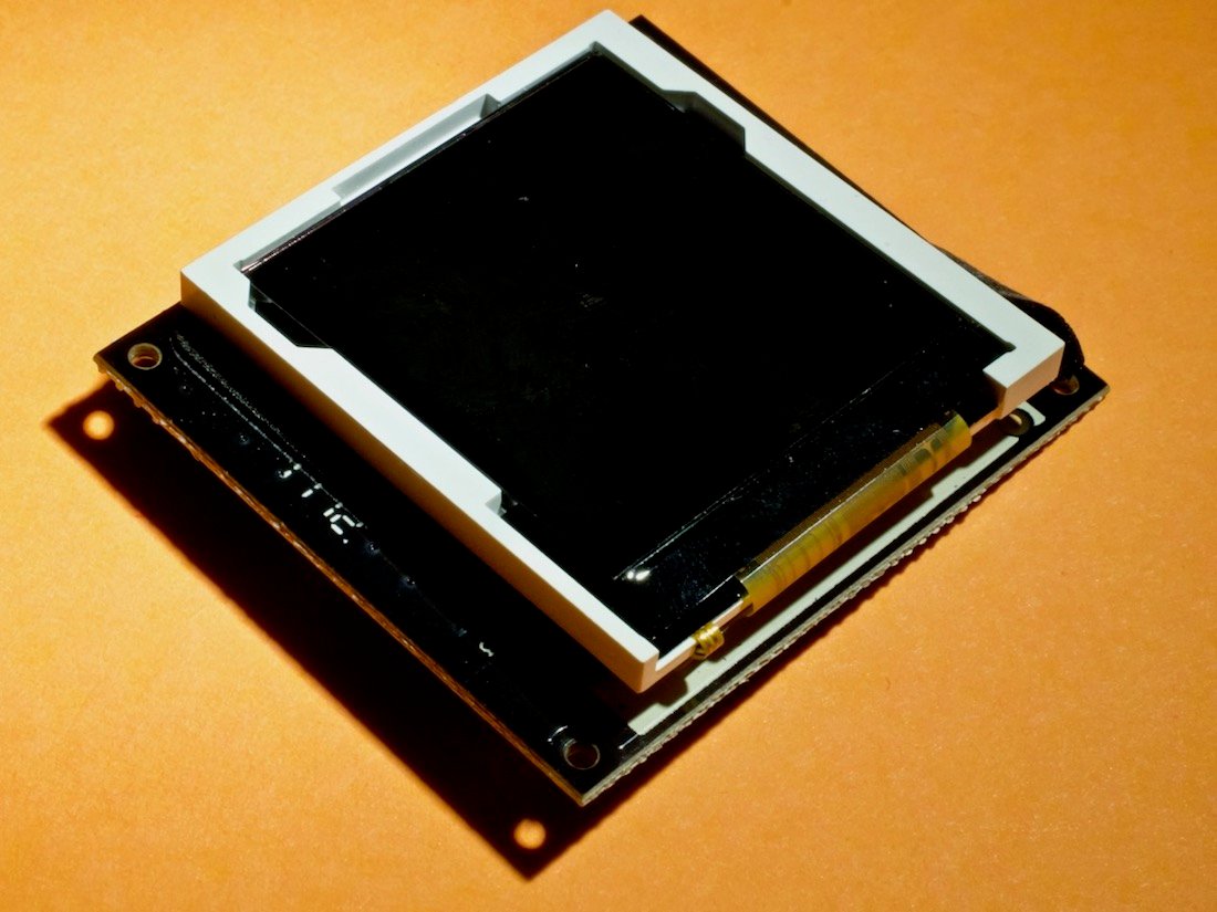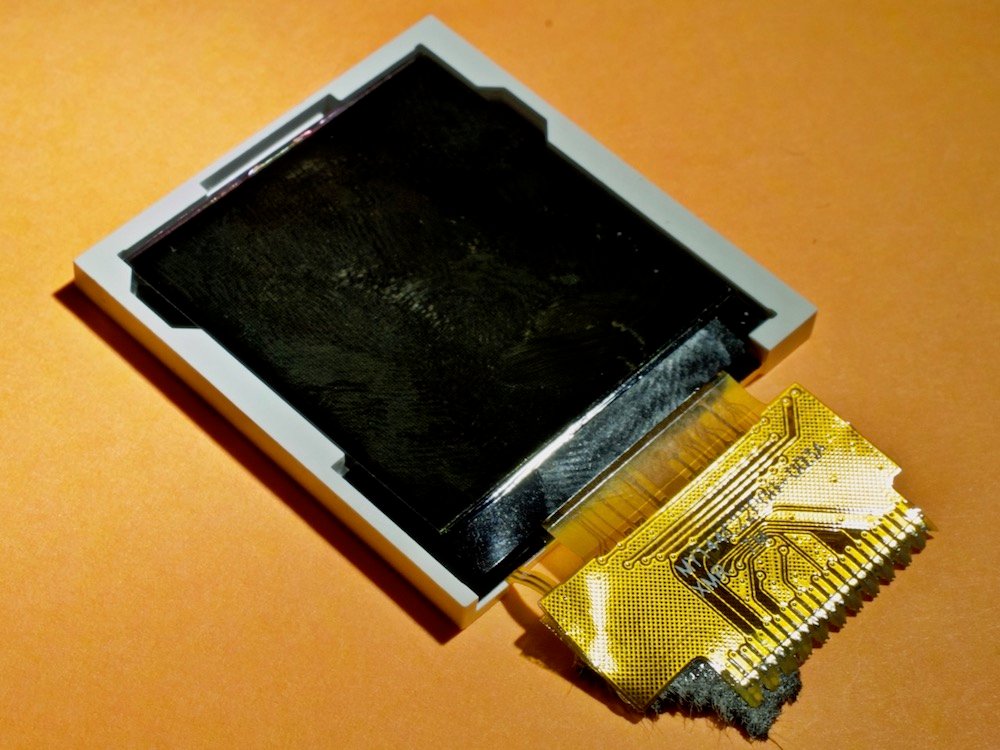 There is an onboard LCD display that shows the settings menu and lets the user preview the image. This LCD is 1.44” diagonal and is 128 x 128 pixels, giving it a pixel density of about 107ppi (about ⅕ the pixel density of a Samsung Note 8). This display has a date code indicating it was manufactured 8/22/2016.