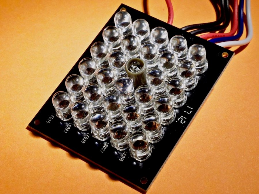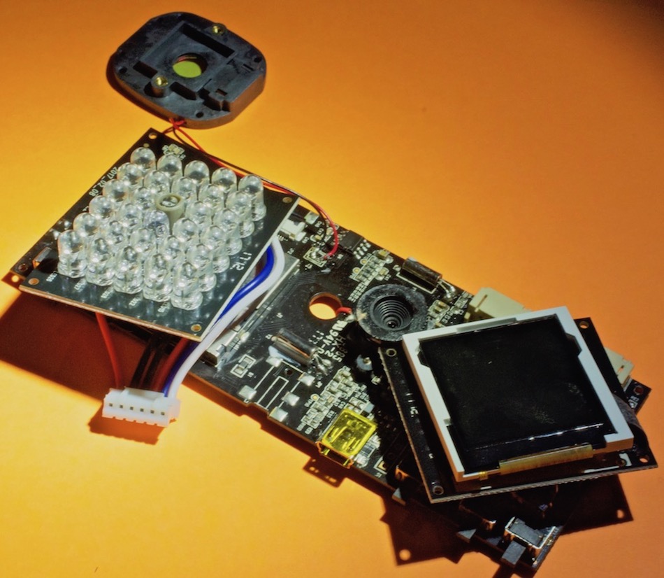 The LCD board contains the LCD display and a connector. A square of adhesive foam is used to provide stress relief and padding for the LCD and its associated ribbon cable. The IR light board contains 28 5mm IR LEDs, a 5mm red LED, a photodiode and a handful of surface-mount passives on the solder side of the PCB.