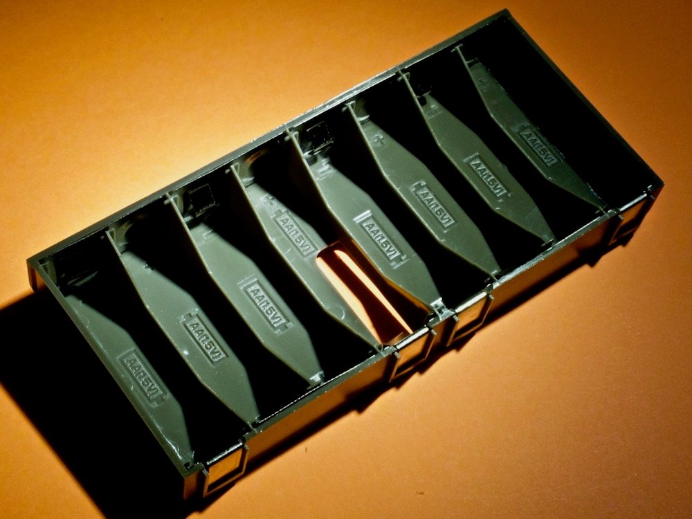 The batteries are inserted into a removable battery tray. The tray connects to the electronics via four spring contacts. The voltage from the batteries is then regulated using a pair of switching power supplies.