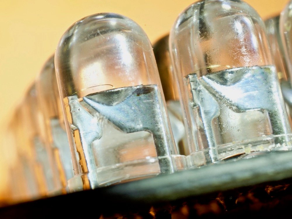 There are 28 5mm IR LEDs on the camera. These LEDs are powered directly from the batteries. There are 14 pairs of series LEDs that are current-limited with a 100-ohm resistor. This would provide around 14mA to each LED for a total current draw of around 400mA. According to the included manual, the IR LEDs have a range of “about 15 m”.
