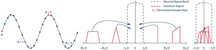 In Figure 1, we can see that without a front-end analog filter or a digital postprocessing filter, a simple signal with decimation by 8 (left) will alias new unwanted signals (center) to frequency fold into the new desired signal band (right). Digital postprocessing, with a digital signal processor (DSP) or microcontroller unit (MCU), using a half-band FIR low-pass filter as a companion to decimation, will help prevent this issue by filtering the interfering aliased signals.