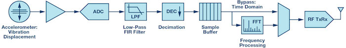 Figure 2 shows a signal chain for machine condition monitoring where an accelerometer sensor measures a displacement vibration signature. With postprocessing at the edge sensor node, frequency analysis can be done within a narrow bandwidth of interest by filtering and decimating the sampled data ahead of FFT computation.