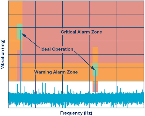 Figure 3 provides an example of an FFT where specific predetermined zones are interpreted within the edge node MCU for more than one observed mechanical component. Bin energy that peaks within the required green zone represents satisfactory operation, while the yellow and red zones indicate warning and critical alarms respectively. Instead of transmitting the full sensor bandwidth, a lower data rate alarm or trigger breadcrumb can alert the system of an excursion event within the zones of interest.