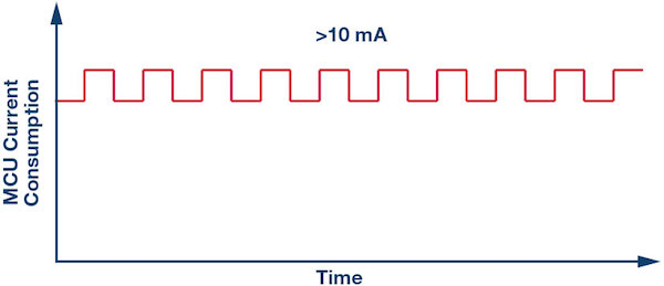 Without consideration for the MCU current consumption, a mostly active state will consume considerable power within the edge sensor node and reduce the lifetime of a battery-powered application to mere hours or days.