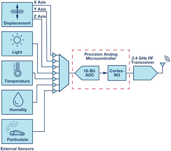 Advanced analog microcontrollers provide a full mixed-signal computational solution. A front-end analog mux with an embedded precision analog-to-digital converter (ADC) allows for a more advanced sensor fusion approach. Multiple sensor inputs can be sent to a single microcontroller ahead of digital processing. On-board digital-to-analog converters (DACs) and microcontroller feedback to other nearby equipment permits a rapid feedback loop. Other embedded circuit blocks such as a comparator, band gap reference, temperature sensor, and phase-lock loop provide additional algorithm flexibility for a multisensor edge node.10
