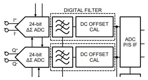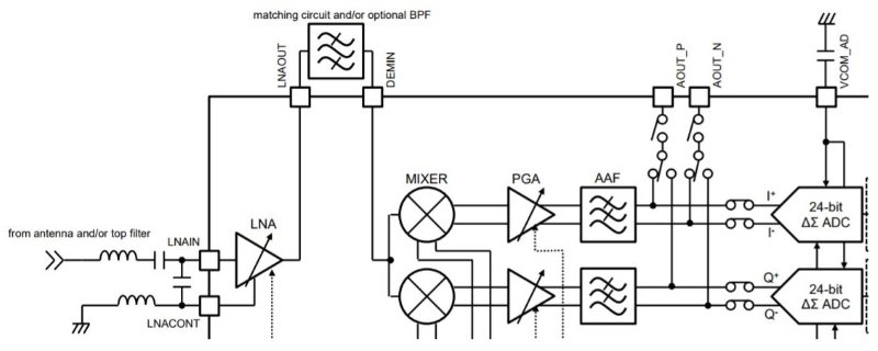 So the RF signal is received from the antenna and then amplified by a low-noise amplifier (LNA). It then goes to an external matching circuit before reaching the mixer. The mixer translates the signal from the RF frequency directly to the baseband frequency; the result is differential I/Q baseband signals that are amplified and passed through an anti-aliasing filter before being digitized by the 24-bit delta-sigma ADC.