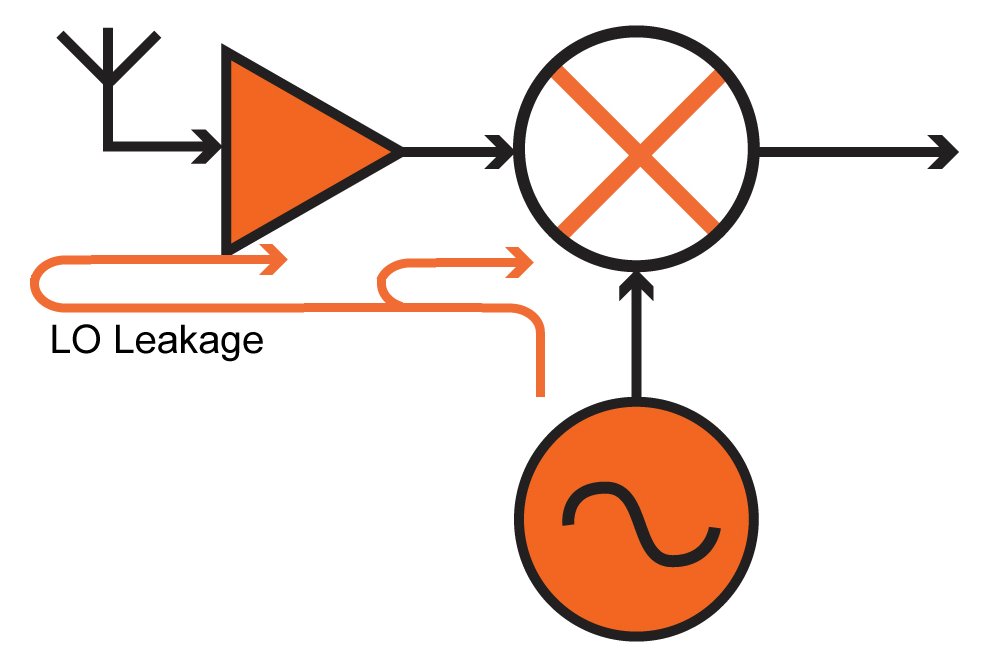 This diagram depicts one common cause of DC-offset generation in a direct-downconversion receiver.
