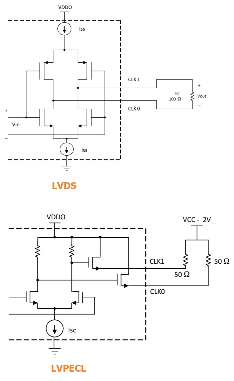 You have several different output flavors to choose from. There are three output pins, but these can be configured as three single-ended clock outputs or one single-ended and one differential output; the differential output can be configured as LVPECL, LVDS, HCSL, or CML.