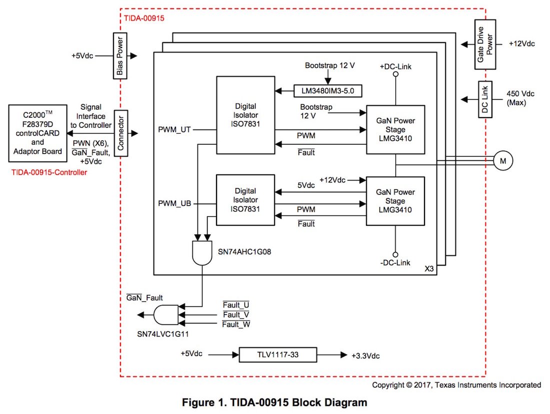 The reference design, released on Tuesday, is for a three-phase high-frequency GaN inverter. It's built around TI's LMG3410 600 V 12-A gallium nitride (GaN) power module. Specifically, it's built around six of these power modules.