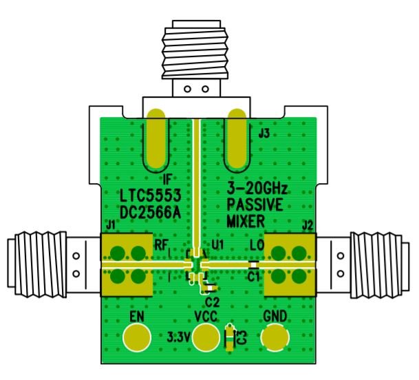 Designing RF printed circuit boards is not something I would describe as easy, and it’s not always a great way to evaluate a particular part. The issue is that inadequate performance could be due to PCB imperfections rather than the part itself. Thus, it’s handy when RF components, such as the LTC5553, offer a companion eval board.