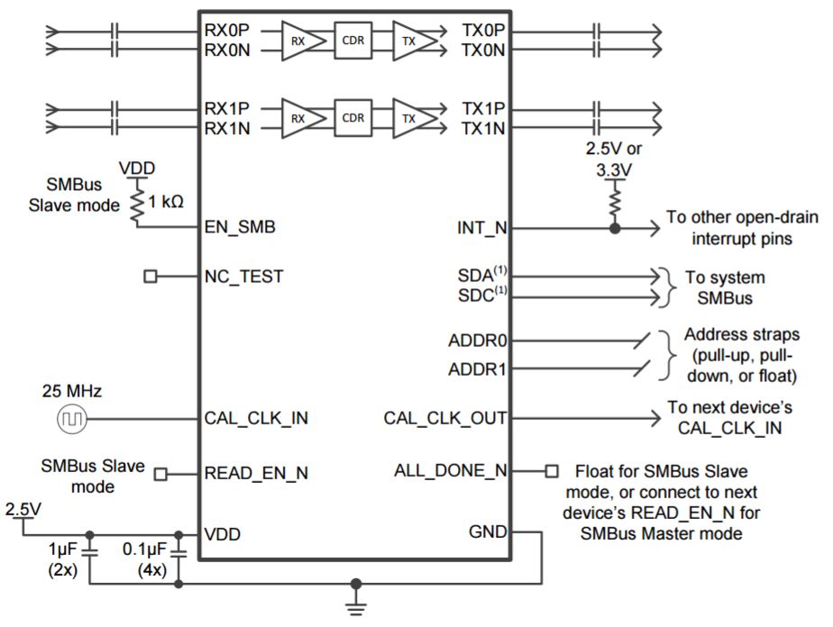Perhaps TI recognized that a few engineers might be intellectually spent by the time they finished browsing the datasheet and, to compensate for this, they made extra efforts to simplify the board design required for this part. The datasheet declares that the DS250DF210 has “minimal need for external components” and the list of features indicates that an external “low-jitter reference clock” is not required and that the part can cope with “minimal supply decoupling”.