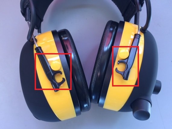 The first disassembly step involves unclipping the over-the-head attachment from the ear protection "cups". A moderate opposing force between the two pieces forces them to separate. The two red boxes, in the figure below, shows the disconnection.