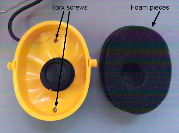 Foam ear padding, retaining fixture, and foam padding removed, revealing speaker and torx screws.