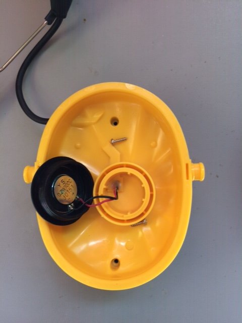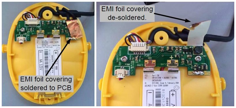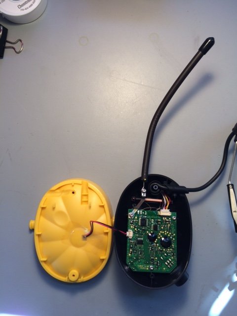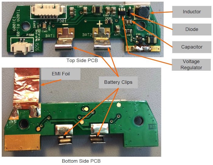 Once the torx screws are removed, the black outer pieces can be separated from the yellow pieces. After removing the battery-side enclosure, a small PCB is revealed. See figures below.
