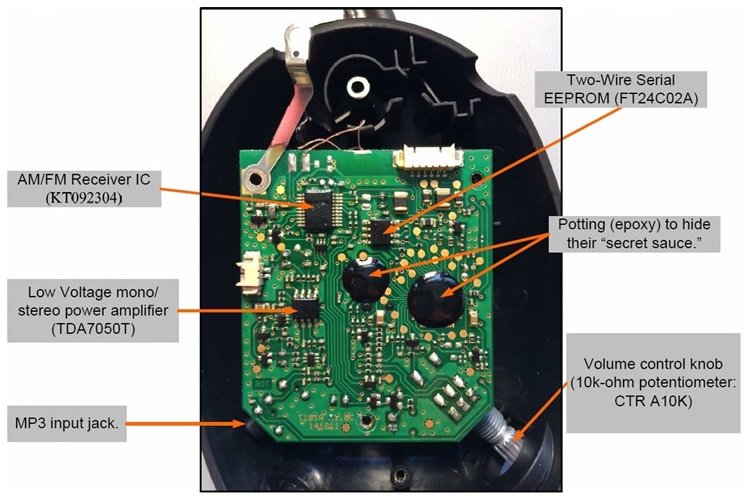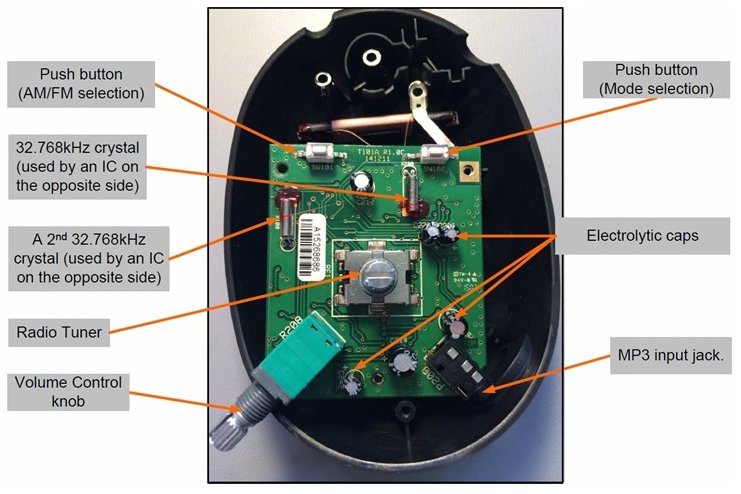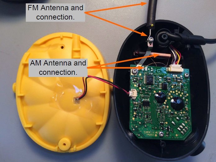 Like before, with the battery enclosure, after removing the two torx screws the black enclosure can be removed which contains a larger PCB. Besides the PCB itself, the other major components are the two antennas: one for AM and one for FM. The FM antenna is a whip-type antenna. The AM antenna, in contrast, is the type of a ferrite rod with a thin wire wound around it. The two antennas are required because AM and FM broadcast on different carrier frequencies: AM uses a carrier frequency range from 540 to 1600 kHz, while FM uses 88.1 to 108.1 MHz.