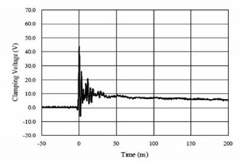 This plot shows how a GiGuard device reacts to an 8 kV ESD strike.