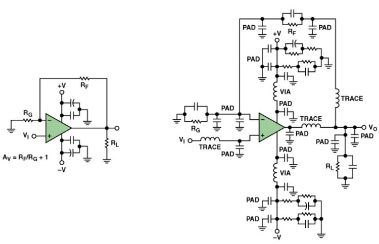 This rather amusing diagram from Analog Devices gives you an idea of how complicated a circuit becomes when parasitic PCB capacitance is incorporated into the schematic.