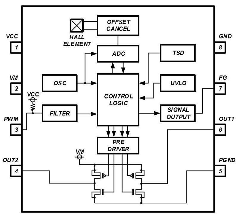 The hall element is physically inside the IC package. Thus, you can’t use the 6909 to drive a motor on the other side of the room. As I was looking through the datasheet I didn’t see any specific information on the necessary physical relationship between the IC and the motor. I find this a bit surprising; perhaps the people who typically design laptop cooling fans already know where they’re going to put the driver chip. The rest of us, I suppose, will have to contact ROHM or experiment.