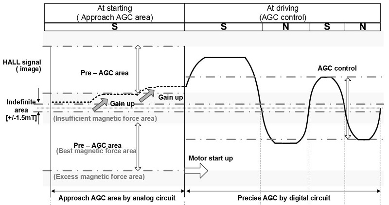 My understanding is that the amplitude of the feedback signal will vary, perhaps significantly, according to the characteristics of the motor and the distance between the motor and the chip. The AGC makes the 6909 more versatile and user-friendly by ensuring that it can automatically compensate for these unpredictable variations. This rather busy diagram visually conveys the AGC functionality:
