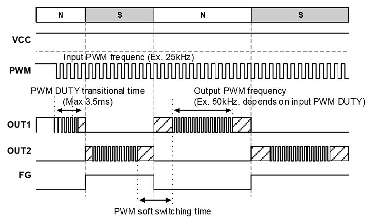 - The polarity of the OUT1/OUT2 motor-drive signals reverses in conjunction with the changes in detected magnetic polarity.