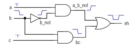 A simple combinational logic circuit is implemented in Figure 1. Every logic device has a propagation delay. Propagation delay is the time difference between an input change and the corresponding output change. This delay can lead to unexpected behavior, such as when a gate accepts two inputs that come from paths with different numbers of gates (and therefore unequal total propagation delay).