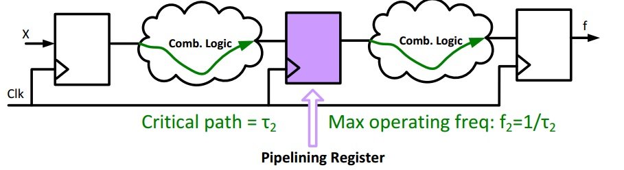 For example, in Figure 4 we have a long critical path that limits the clock frequency. However, the divided and pipelined path (see Figure 5) contains shorter combinational paths, and this means we can increase the clock speed. However, as a trade-off, the latency of the path will increase.