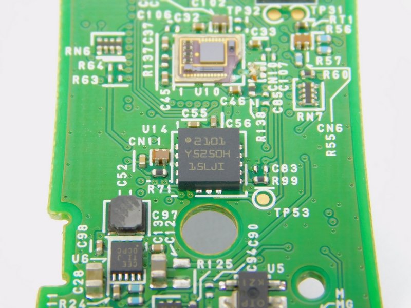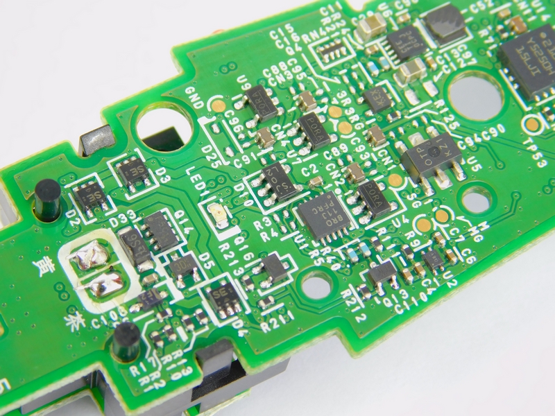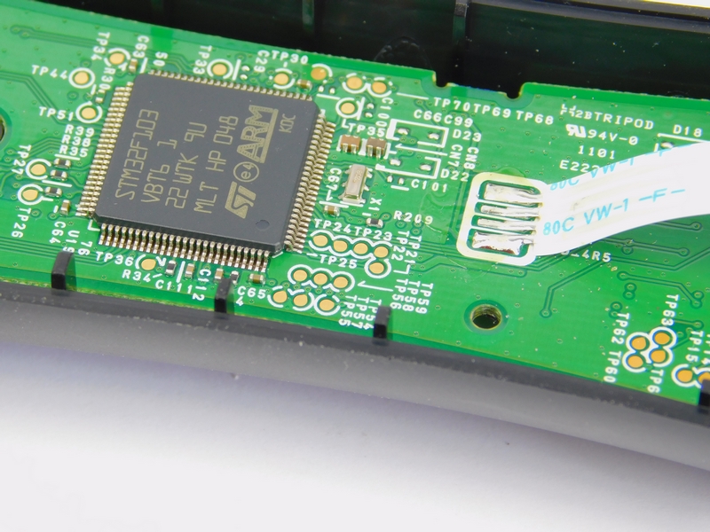 Next to the microcontroller are many gold pads with identifications of TPxx. These are test points that are used to test and program the controller before it is sent out to ensure that it functions correctly. Such test points add complexity to the PCB design and incur many costs when producing the item, so they are usually found on more expensive products. It would not make economic sense to vigorously test cheap items that are easily replaced when damaged or faulty.