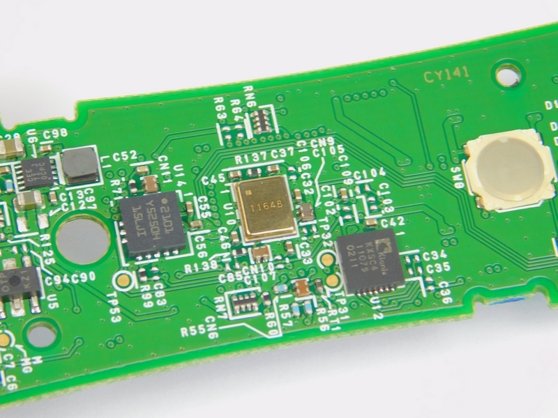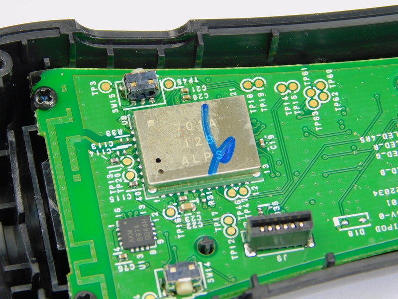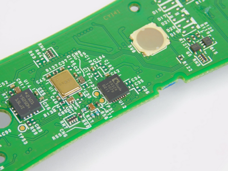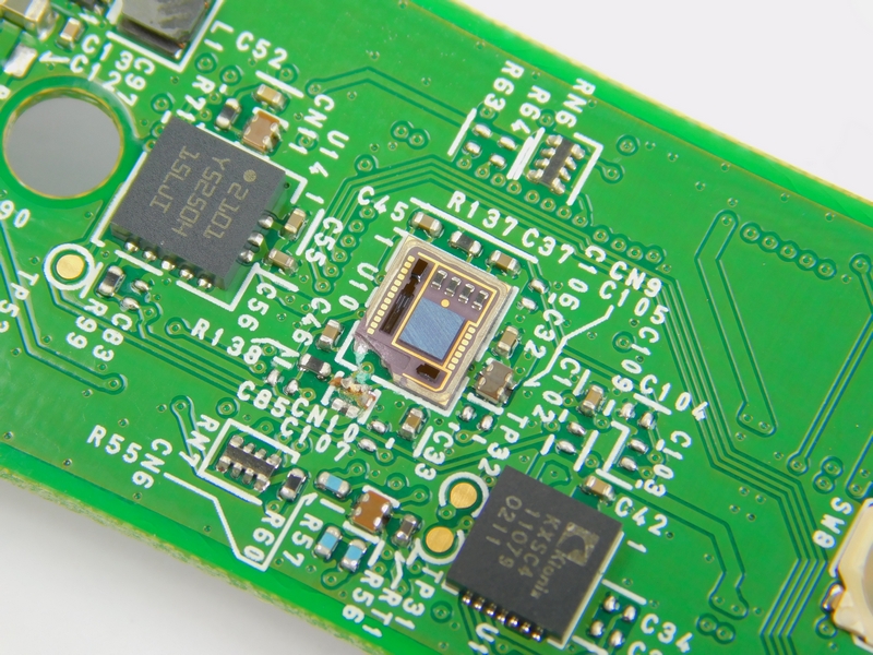 Further down the PCB, several ICs can be found, as well as a module that contains a metal shield. The first IC, the KXSC4, is a 3-axis accelerometer which is useful for gesture detection. Accelerometers cannot be used for absolute position or even current velocity as they only detect a change in speed (remember, acceleration is dv/dt).