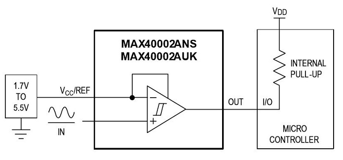 Not surprisingly, Maxim has an answer for this one as well: Two of the devices in the MAX4000x series (the MAX40002 and MAX40003) come with open-drain outputs. Thus, with the help of a pull-up resistor, you can work with output voltages as high as 5.5 V, even if your VCC is only 1.7 V. And you can even dispense with the resistor if the output is going to a microcontroller that has an internal pull-up: