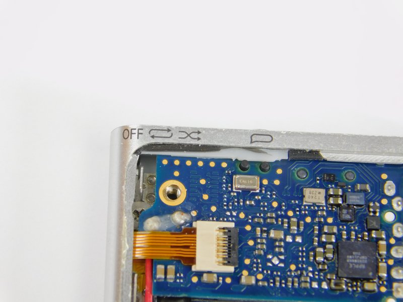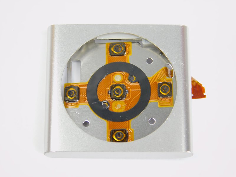 The front buttons on the iPod are situated behind the main PCB and separated with a piece of aluminum. Removing the internal components and screws reveals the flexible material that holds the tactile switches. Interestingly, the internal material was incredibly sharp and so caution is advised when taking apart Apple products!