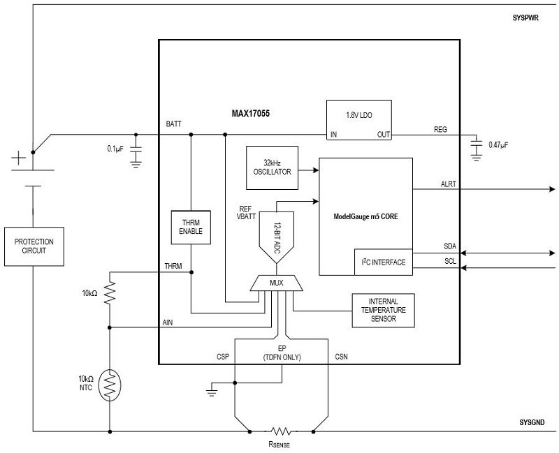 The MAX17055 incorporates digital signal processing circuitry that implements an algorithm dedicated to estimating remaining battery life. In fact, Maxim considers this algorithm special enough to deserve a name: it’s the “ModelGauge m5 EZ” algorithm. It works in conjunction with the device’s hardware to produce fuel-gauge measurement accuracy that Maxim considers quite impressive.