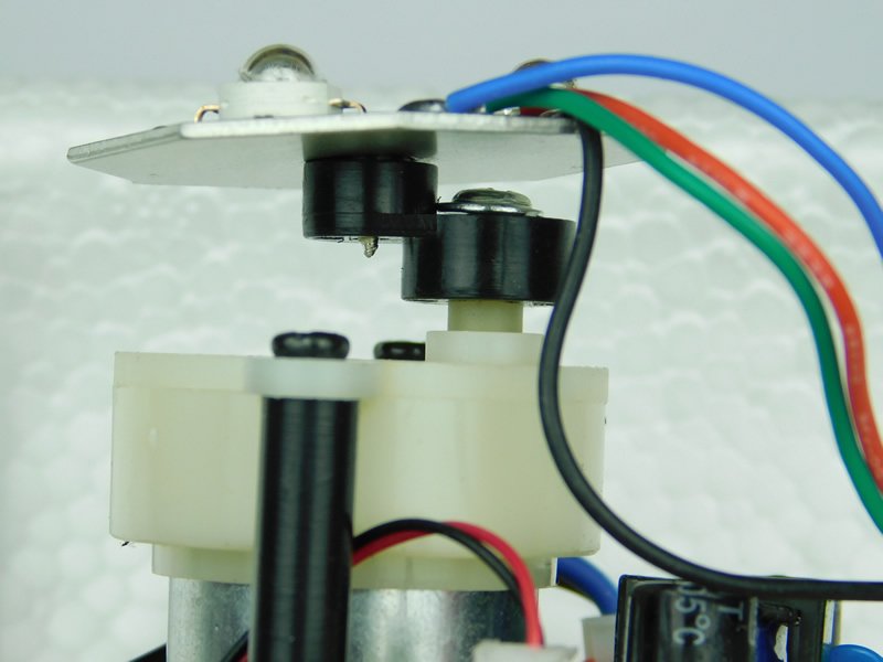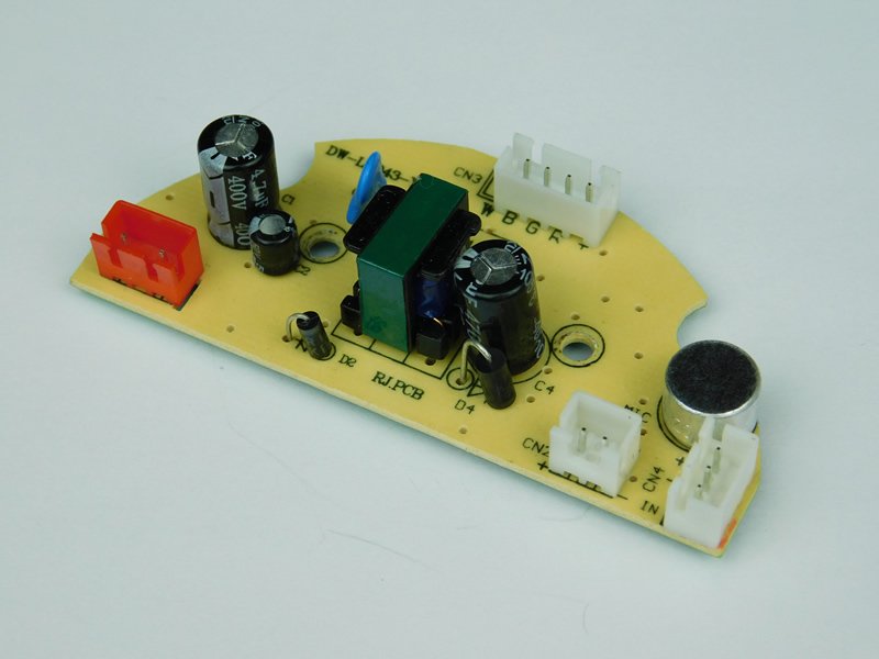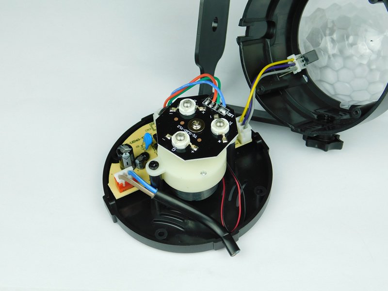 When the unit operates, the LED PCB moves back and forth to give the effect of moving lights when music plays. The PCB cannot be fully rotated due to the four cables that provide the power to the LEDs and so, instead of full rotation, the PCB moves back and forth.