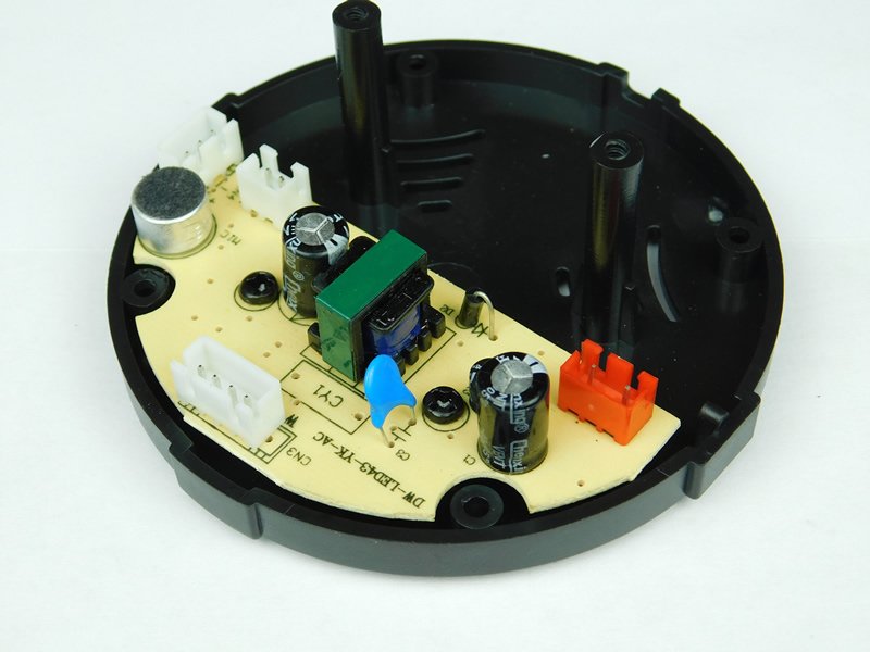 Removing the screws brings out the bottom plastic disc that holds all the major parts including the motor drive, LEDs, and main controller board.