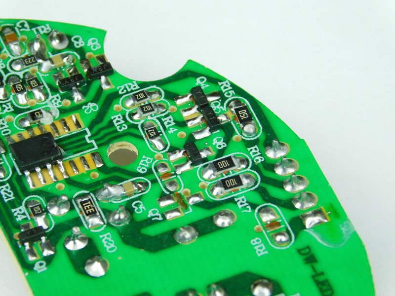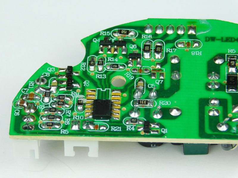 The left side consists of many surface-mount parts that handle the lights and motor.