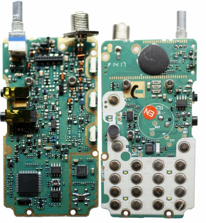 The duplex transceiver and separate FM receiver on this circuit board can be controlled with I²C, so it should come as no surprise that there are people out there who have deconstructed the device and programmed their own microcontrollers.