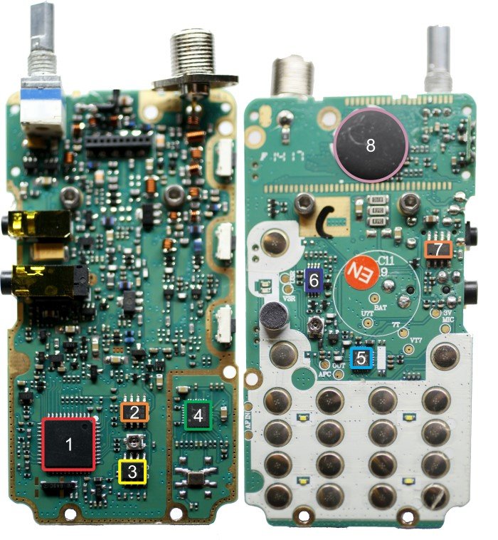 Front and reverse circuit board sides with integrated circuits of interest outlined and numbered