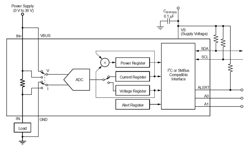 The following application circuit shows the INA260 used as a high-side current sensor, though the device is also compatible with a low-side configuration.