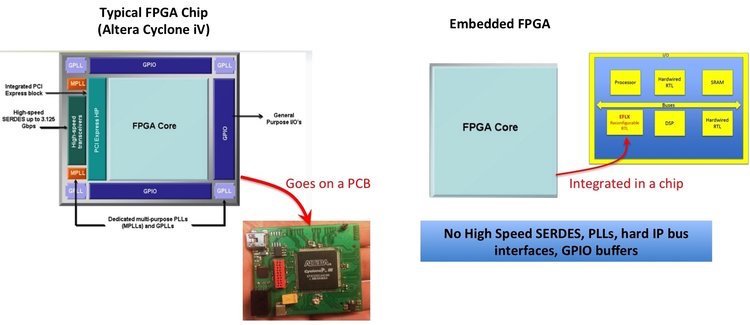 One complexity is that customers want a wide range of sizes and configurations of embedded FPGAs, and everyone wants the IP block proven in silicon before using it in their chip.