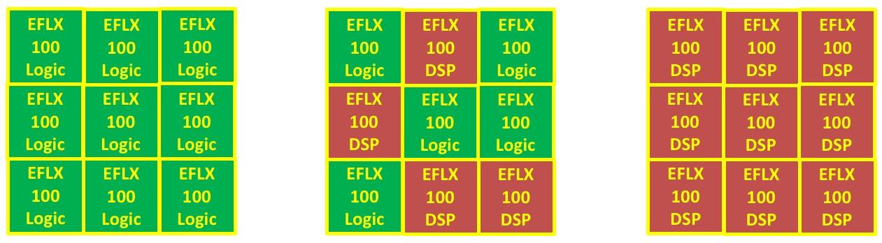 Flex Logix uses a tileable building block approach. First, 4 EFLX IP cores are designed using the above approach. Each IP core is a stand-alone FPGA, but they can also be arrayed to offer EFLX arrays, about 75 in total, from 100 LUTs to 122.5K LUTs, with any mix of logic/DSP.