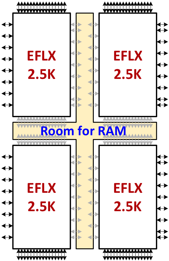Each EFLX IP core has an extra top-layer of interconnect which allows one core to connect automatically to surrounding neighbors to make a large array up to NxN.
