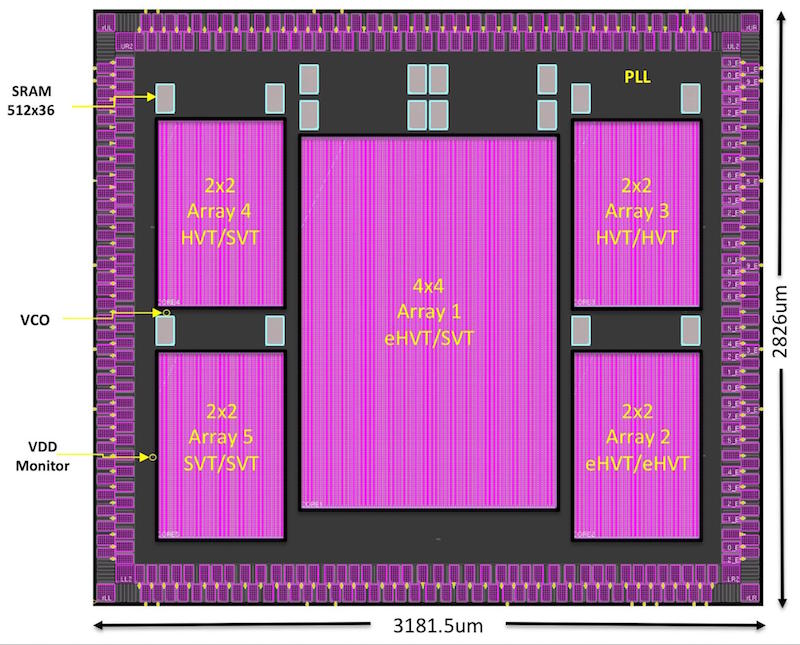 In that process, there are a wide range of VT (voltage threshold mask) combinations that customers use and Flex Logix designed the EFLX array to be compatible with all the possible combinations. So the validation chip has five arrays: one large array (4x4) in the most requested VT combination and four 2x2 arrays in the other four sizes.