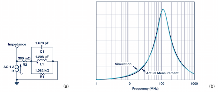 Figure 2(a) shows the circuit simulation model with the calculated values. Figure 2(b) shows both the actual measurement and simulated result. In this example, the impedance curve from the circuit simulation model closely matches the measured one.