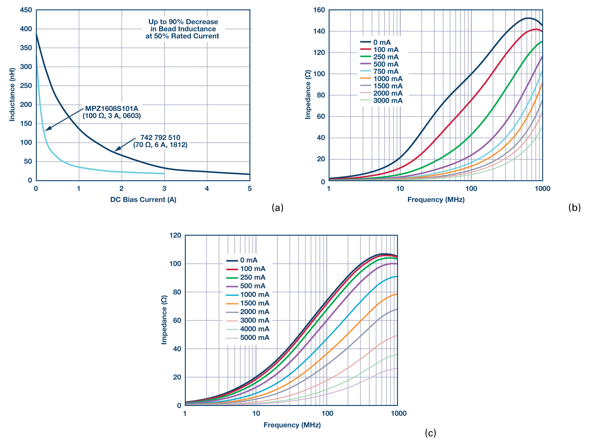 Figure 3. (a) The effect of DC bias current on bead inductance and impedance curves with respect to DC bias current for: (b) a TDK MPZ1608S101A bead, and (c) a Würth Elektronik 742 792 510 bead. Click to enlarge.