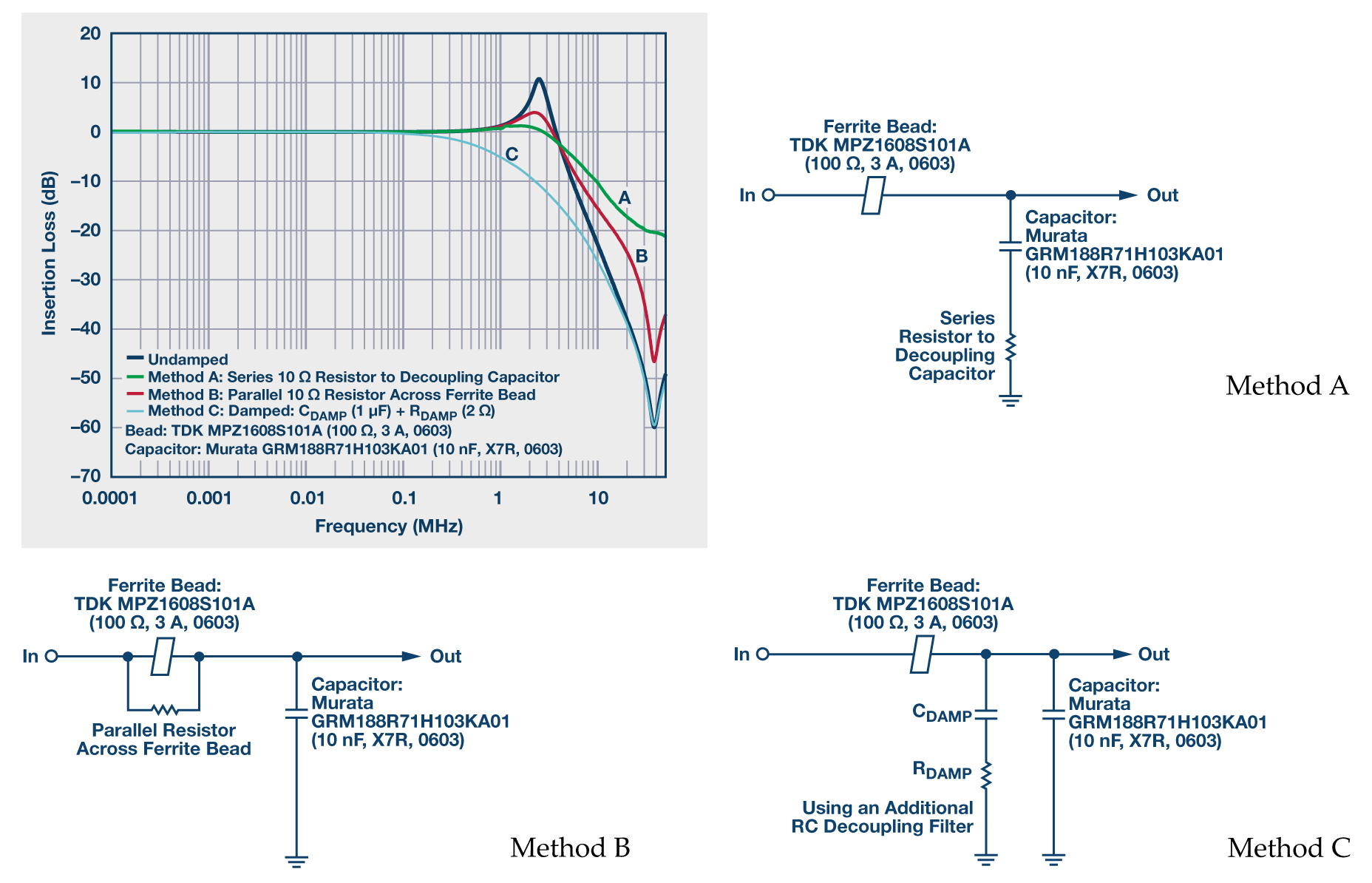 Method A consists of adding a series resistor to the decoupling capacitor path that dampens the resonance of the system but degrades the bypass effectiveness at high frequencies. Method B consists of adding a small parallel resistor across the ferrite bead that also dampens the resonance of the system. However, the attenuation characteristic of the filter is reduced at high frequencies.