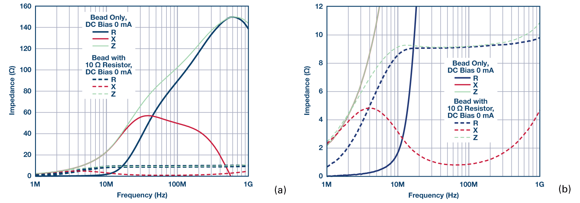 Figure 4(a) shows the measured impedance vs. frequency plot of the TDK MPZ1608S101A. The resistive component, which is depended upon to dissipate unwanted energy, does not become significant until reaching about the 20 MHz to 30 MHz range. Below this frequency, the ferrite bead still has a very high Q and acts like an ideal inductor.