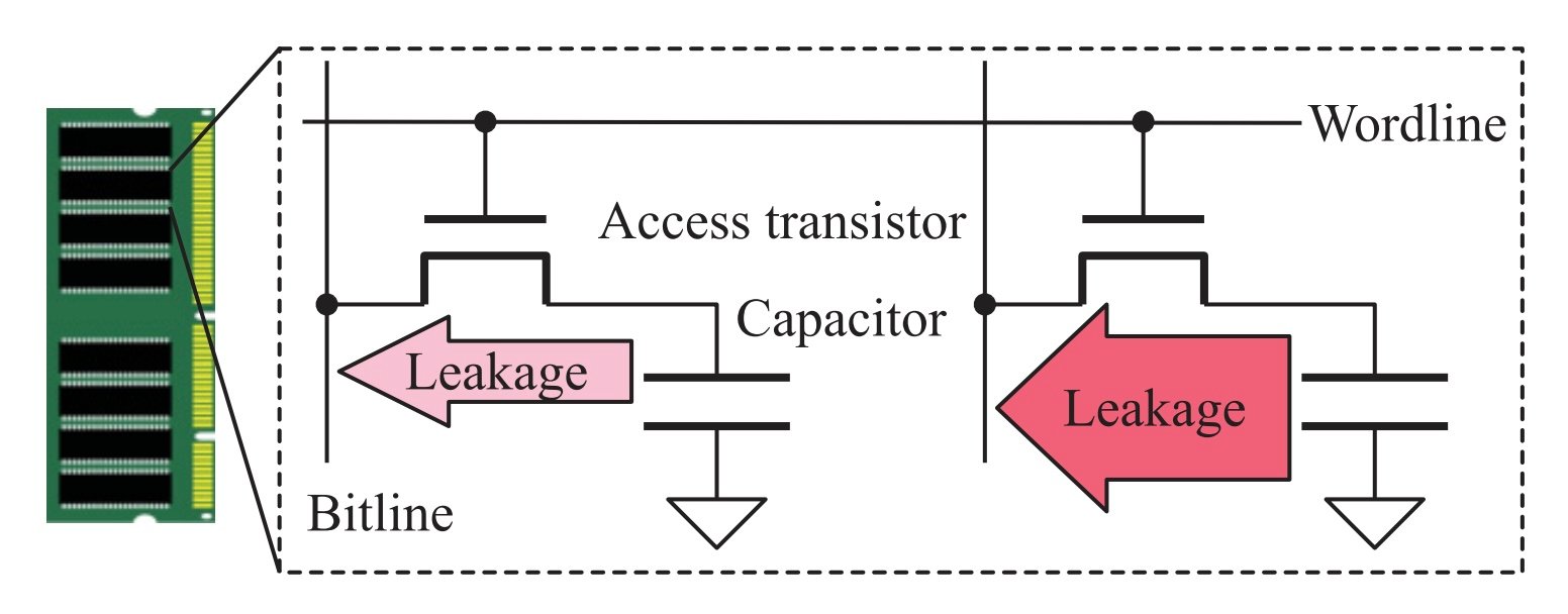 Figure 2. Charge leakage in DRAM cells is highly variable based on process variations. Image from Sutar et al.