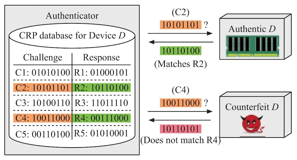 In this instance, the “challenge” is the original binary value asserted to an array of DRAM cells, and the response is the value of that array after the given time interval. This technique may be used to generate truly random numbers for use in a cryptographic key generation, or it may be used for device identification for counterfeit protection. In the latter application, an authenticator may store a database of challenge-response pairs and use this knowledge to identify counterfeits vs authentic devices.